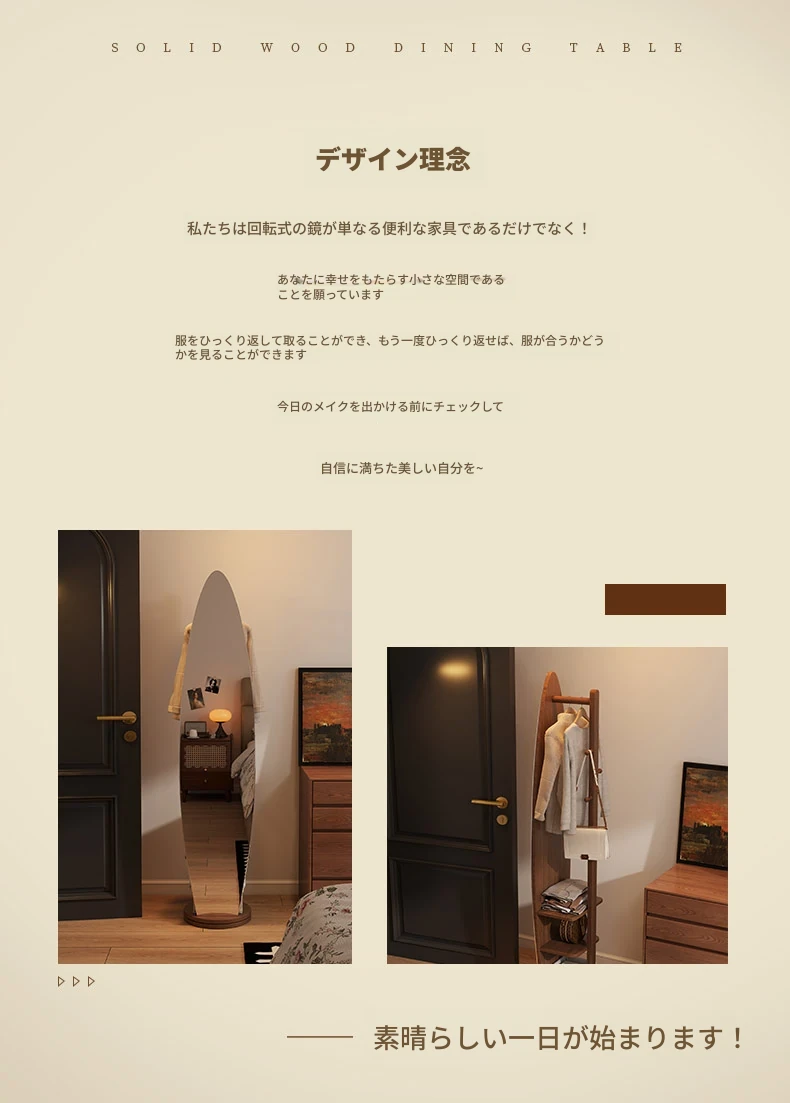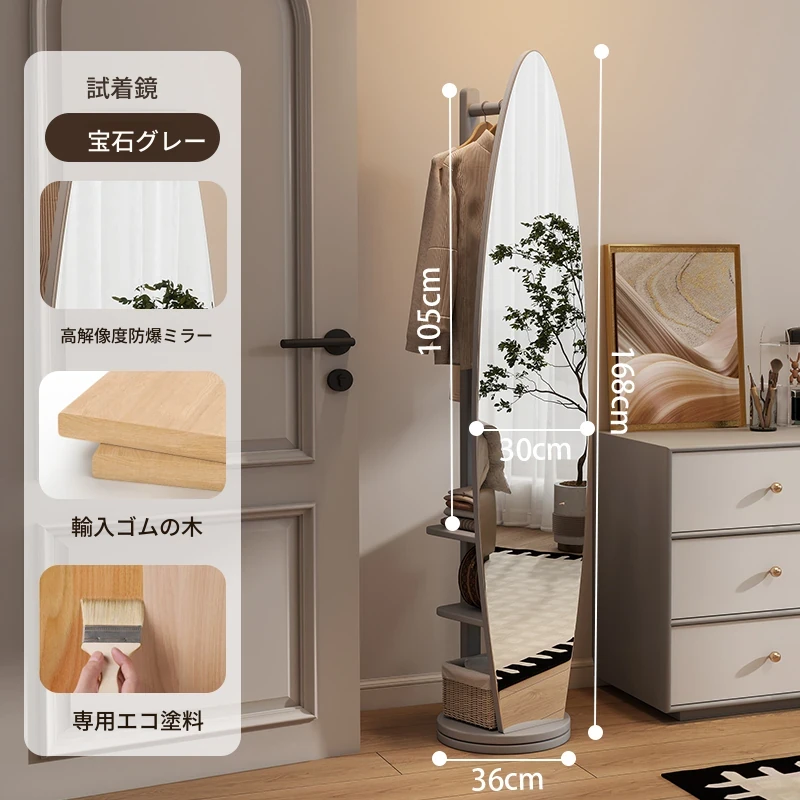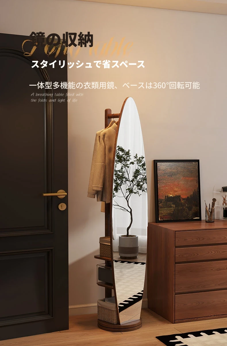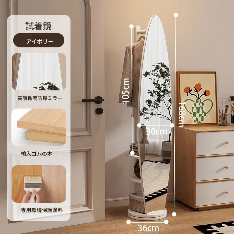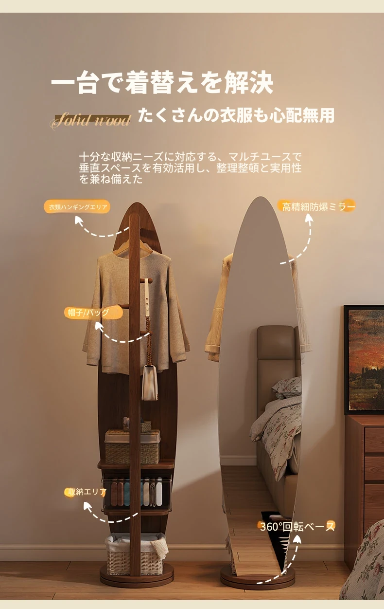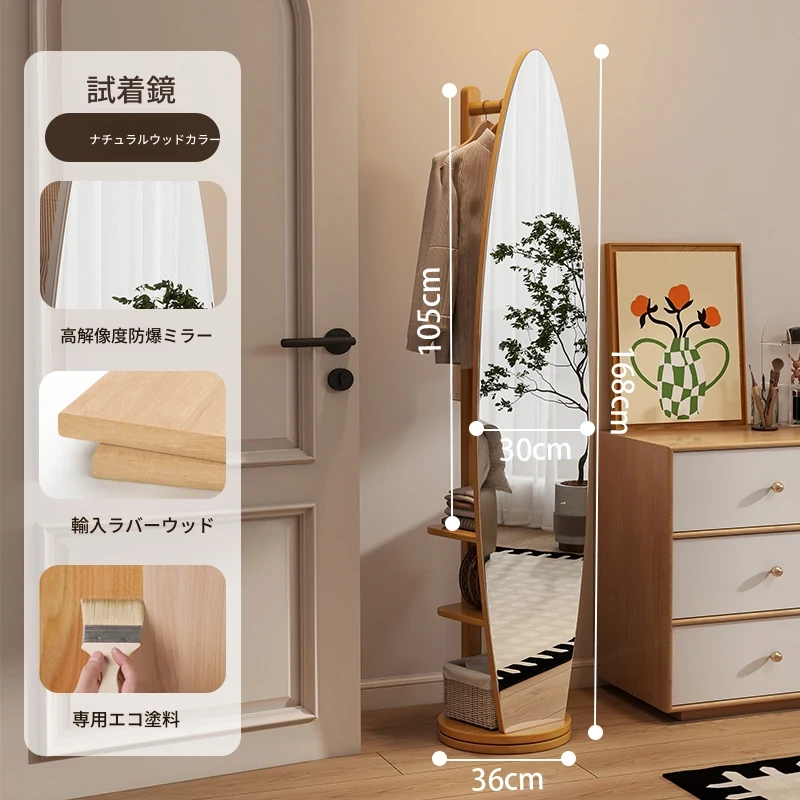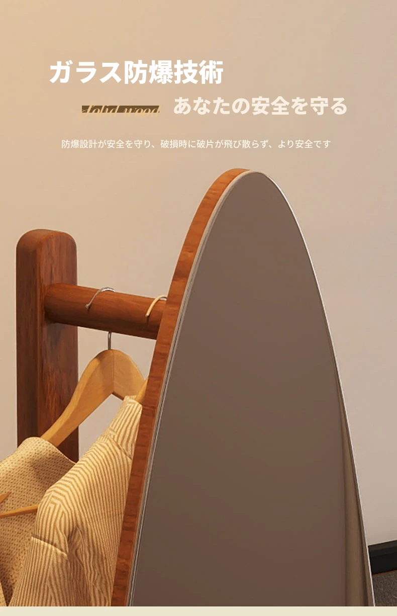 全身鏡とハンガーラックが一体化!シンプルで機能的な木製フロアミラー、あなたの寝室をおしゃれに演出。試着も楽々、衣類の収納にも最適!