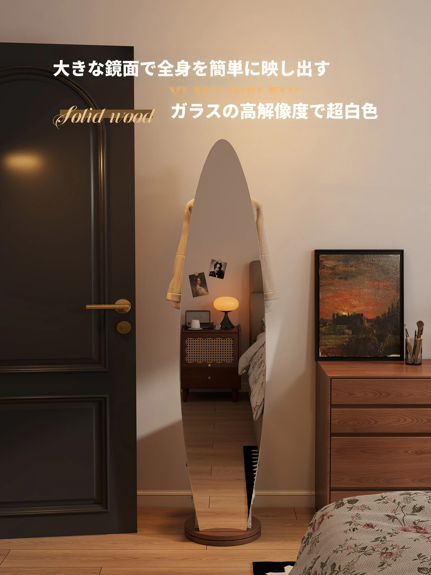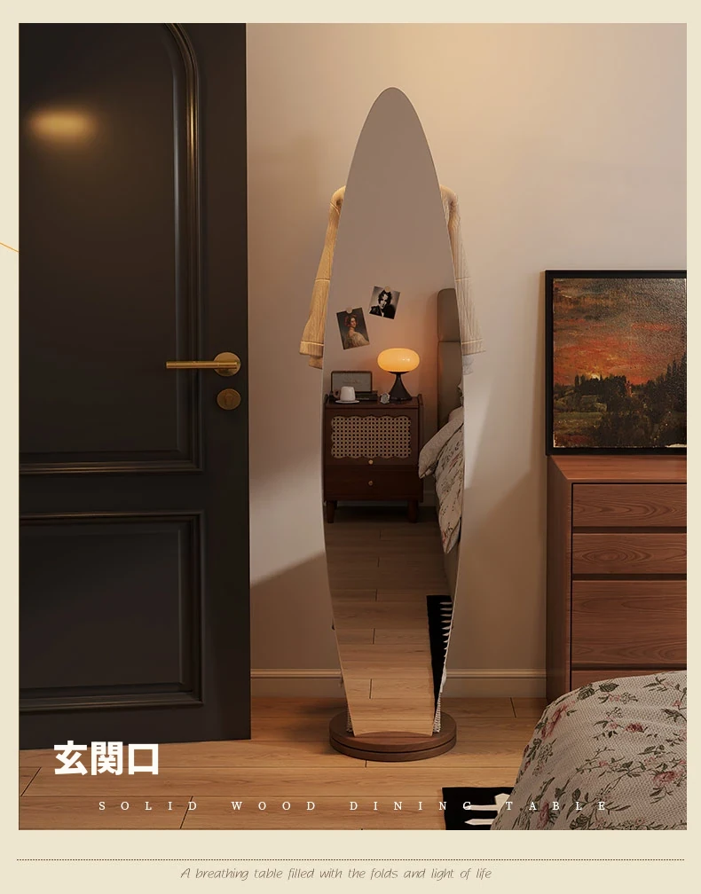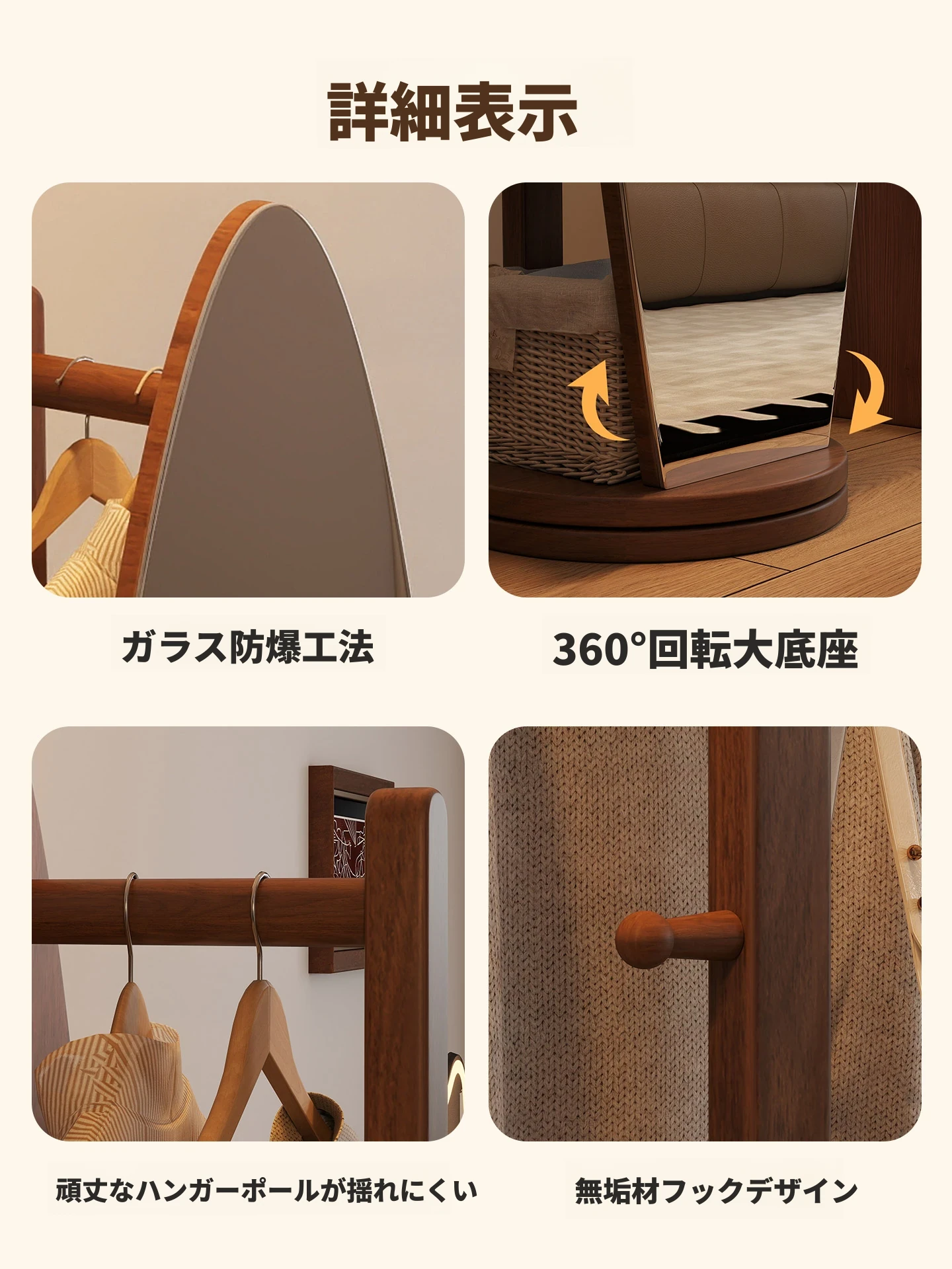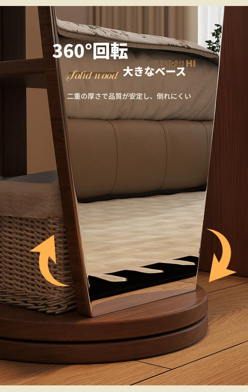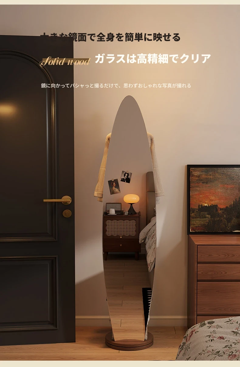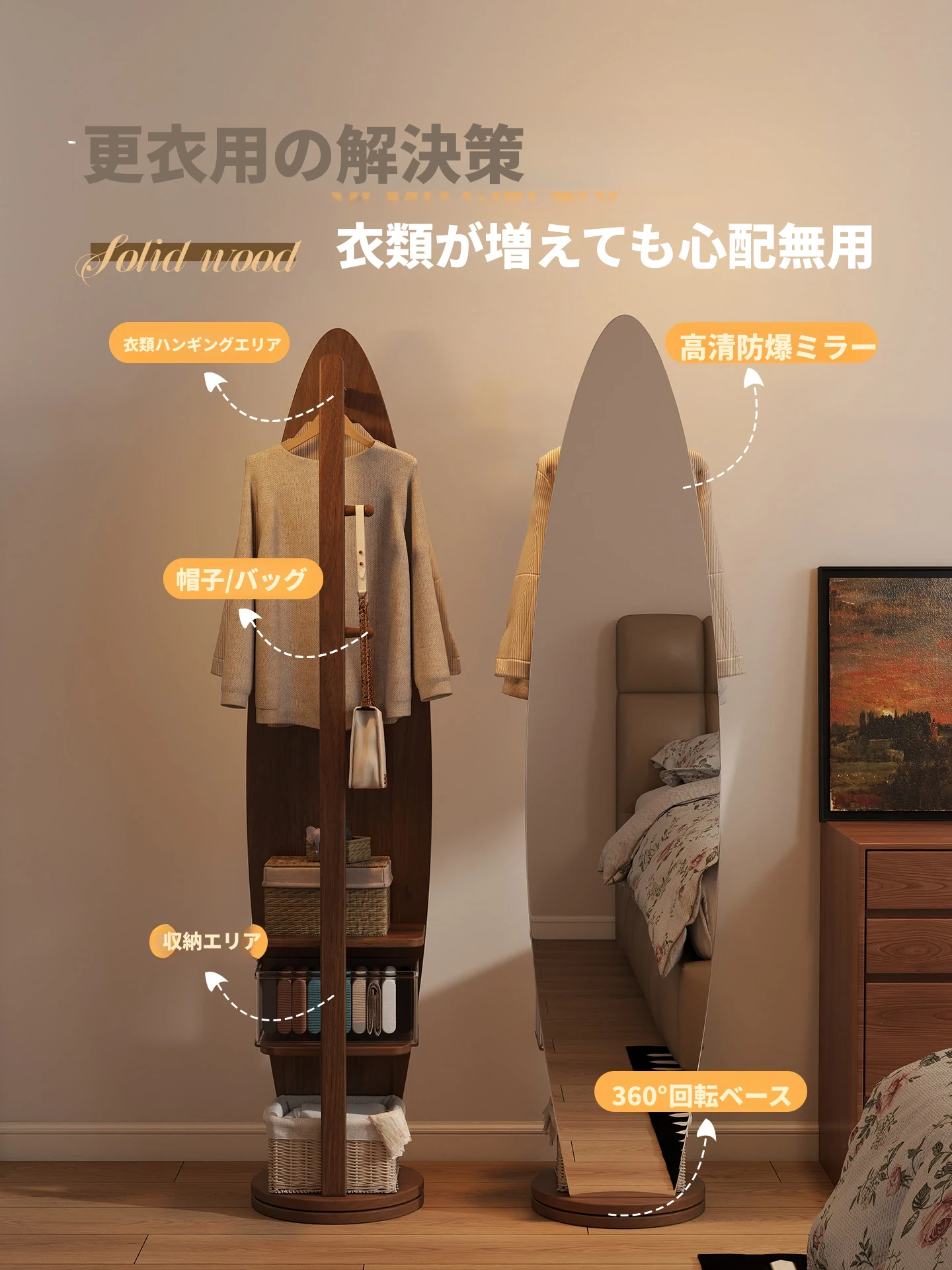 全身鏡とハンガーラックが一体化!シンプルで機能的な木製フロアミラー、あなたの寝室をおしゃれに演出。試着も楽々、衣類の収納にも最適!