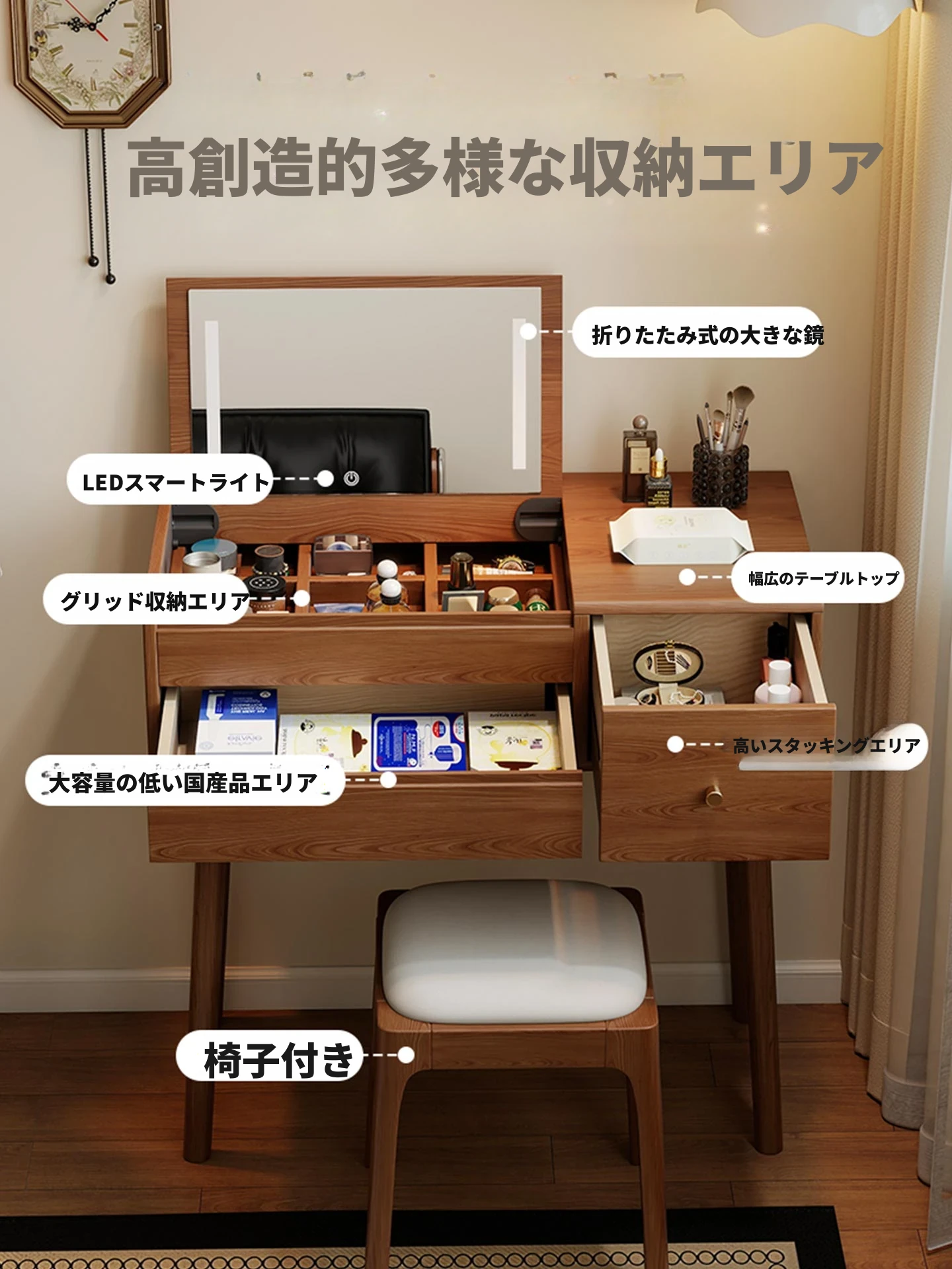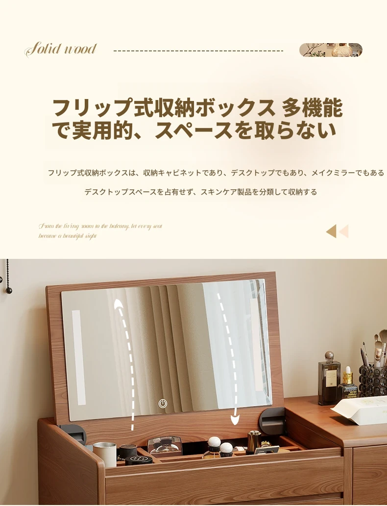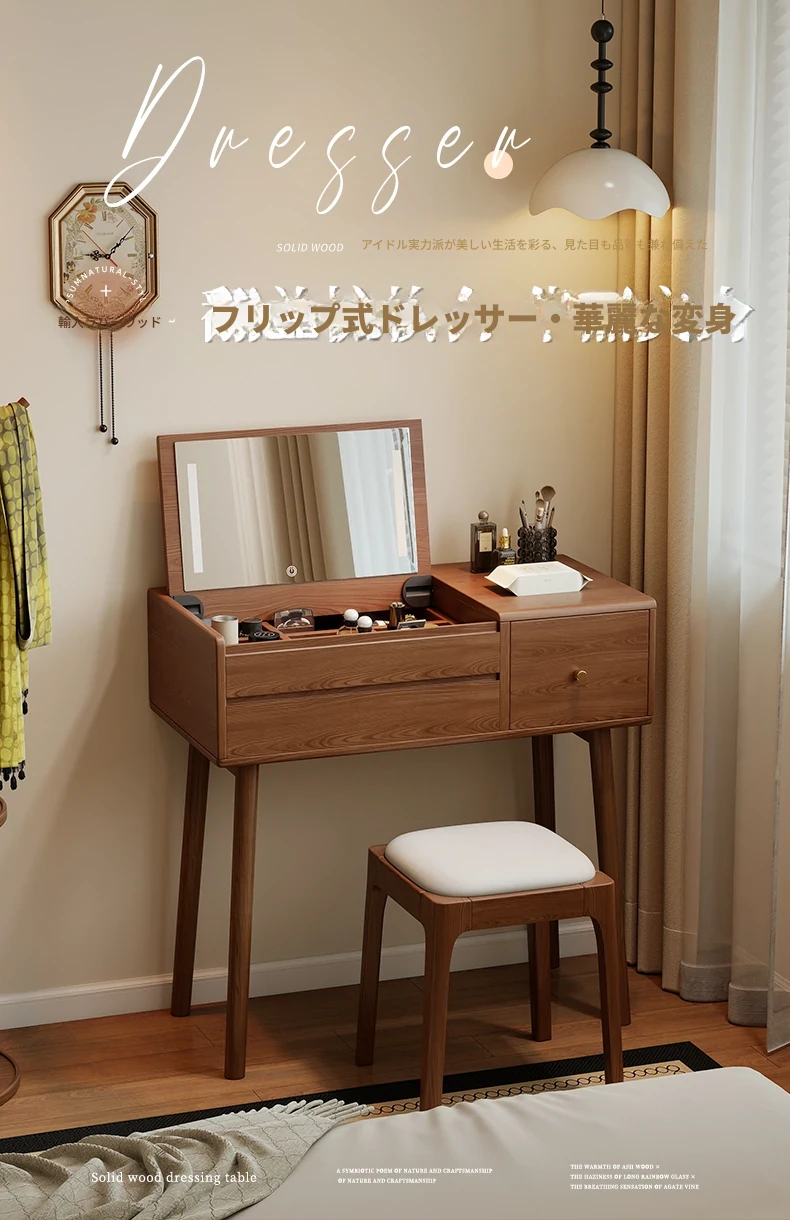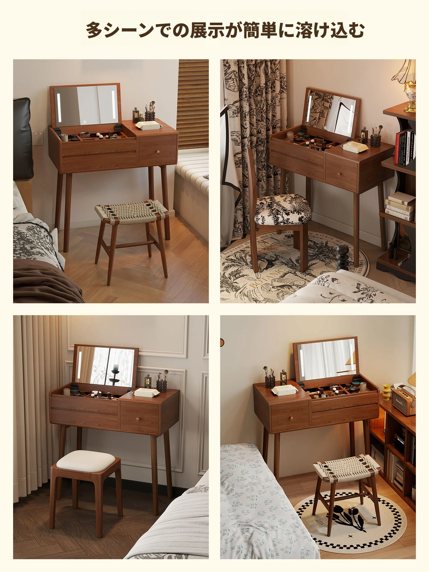全木製の化粧台 - フリップトップ式の隠しミラー付き!小さな部屋にもぴったりなラバーウッド製の洗練されたドレッサー兼デスク。スタイリッシュで機能的なデザインで、あなたのビューティータイムを特別なものに!