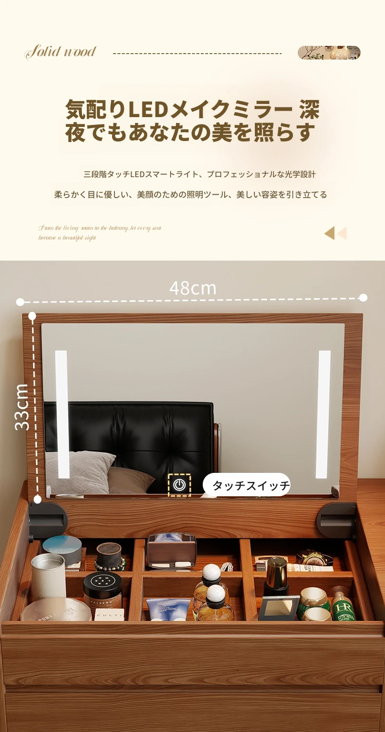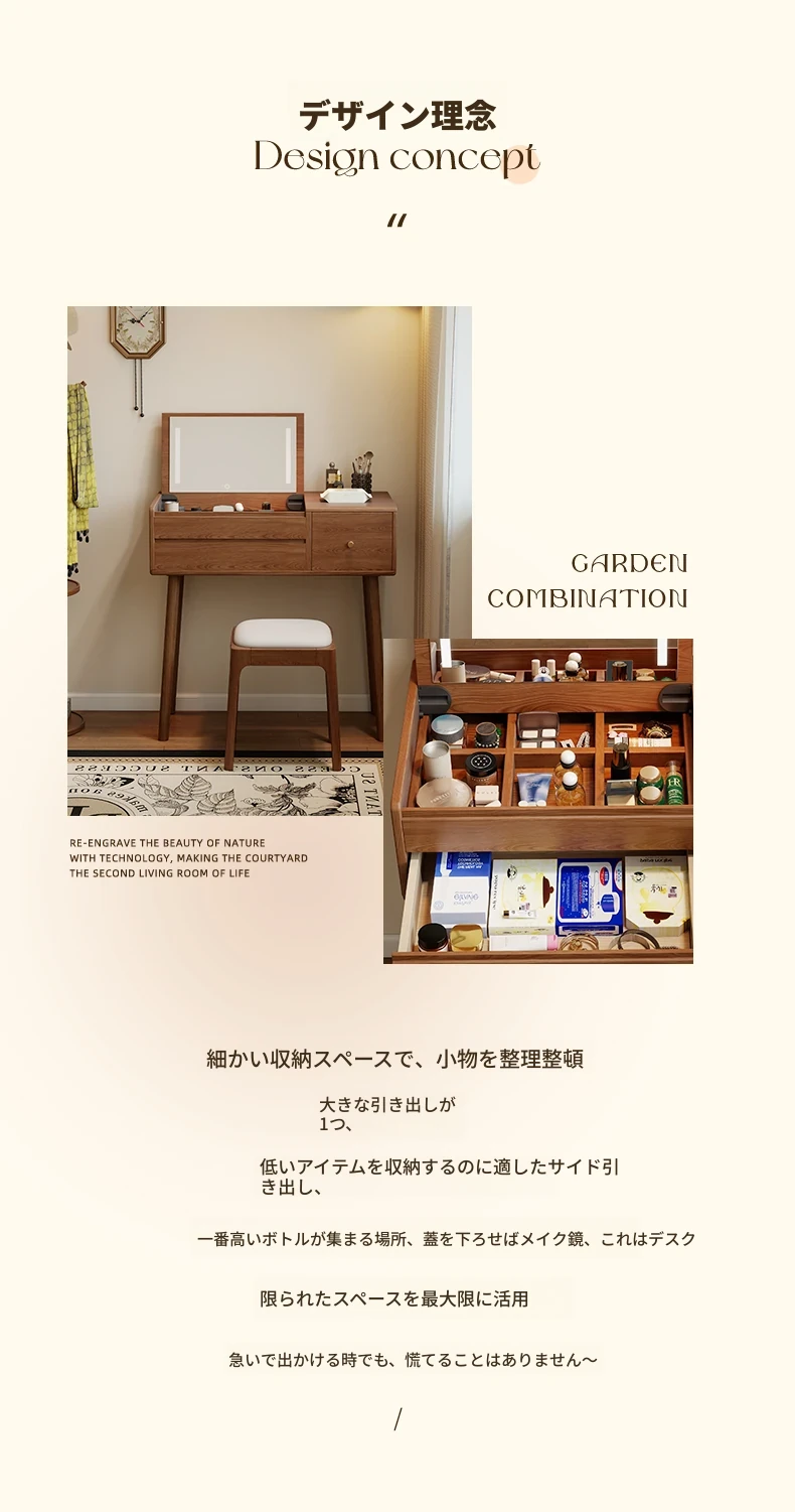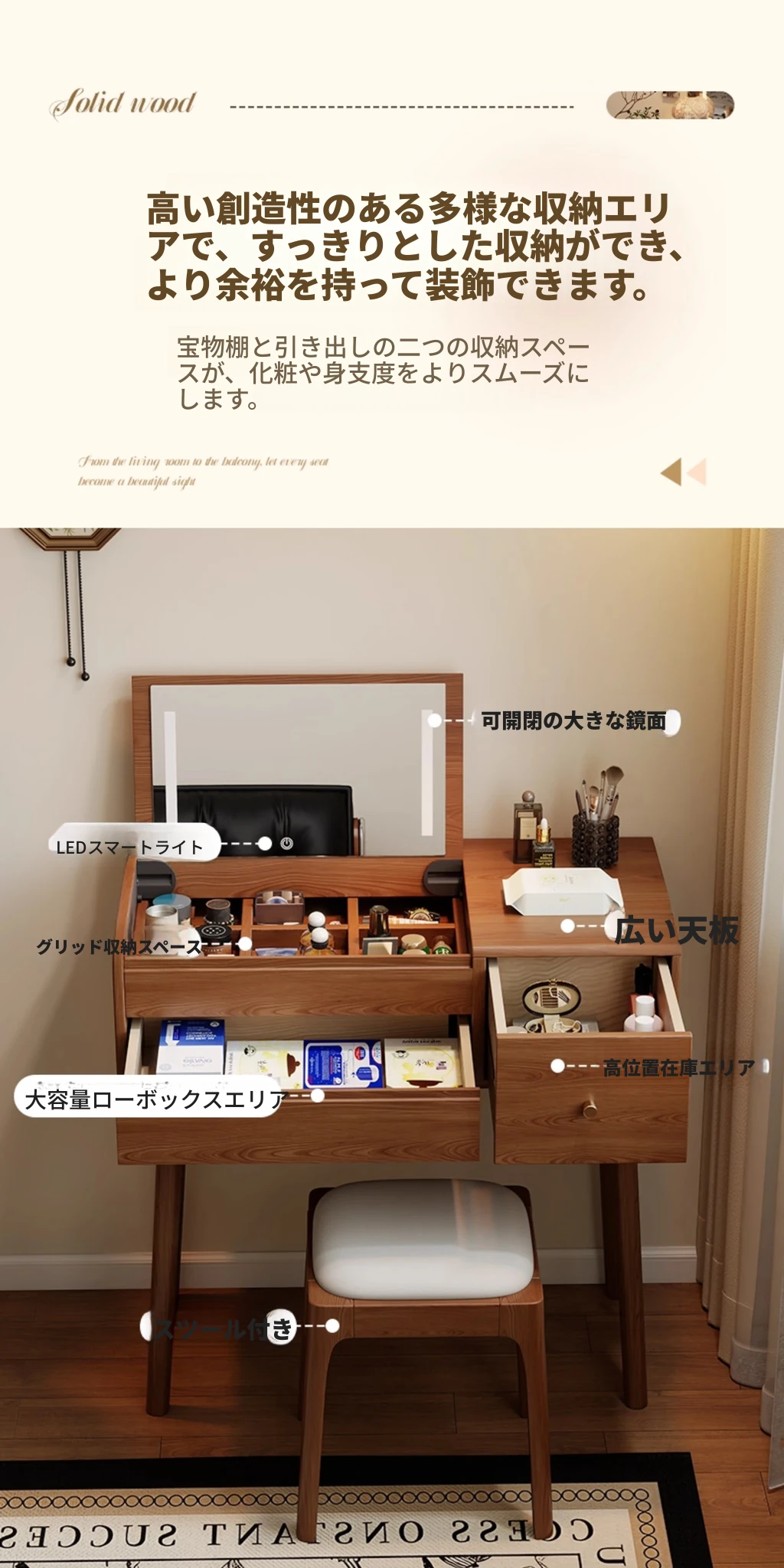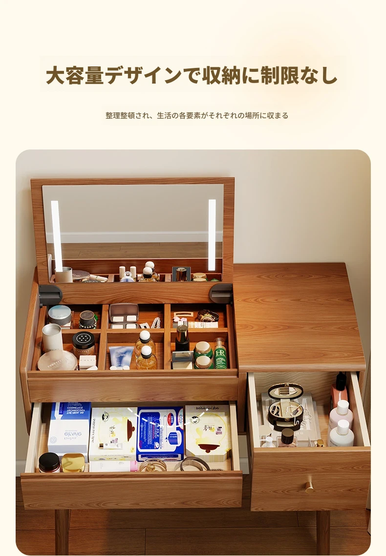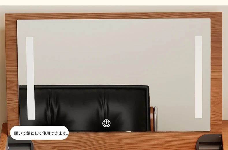 全木製の化粧台 - フリップトップ式の隠しミラー付き!小さな部屋にもぴったりなラバーウッド製の洗練されたドレッサー兼デスク。スタイリッシュで機能的なデザインで、あなたのビューティータイムを特別なものに!