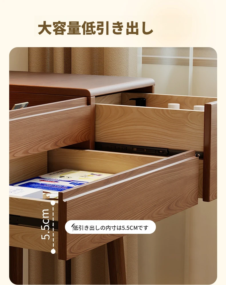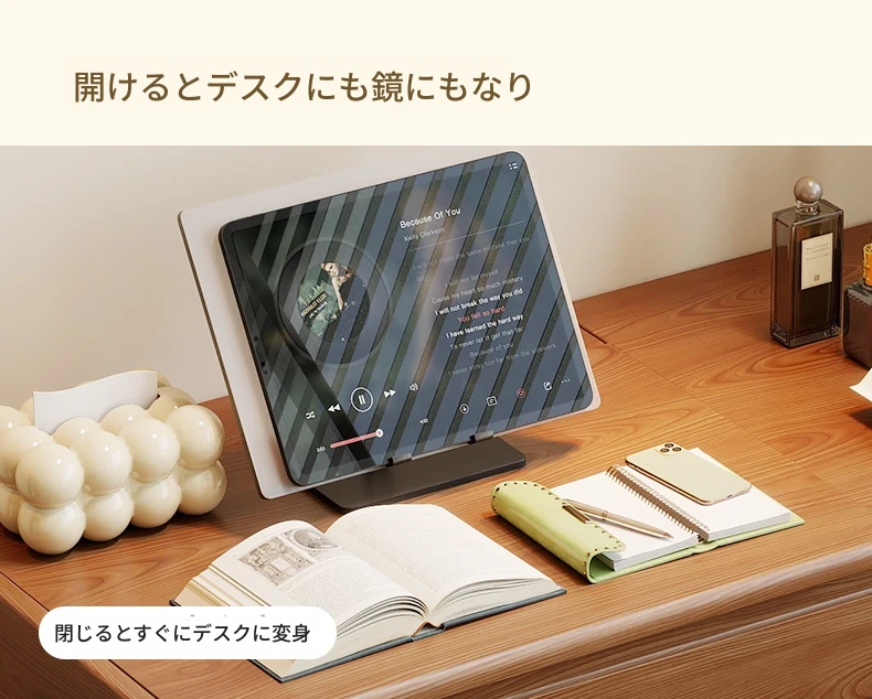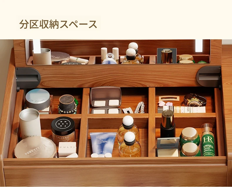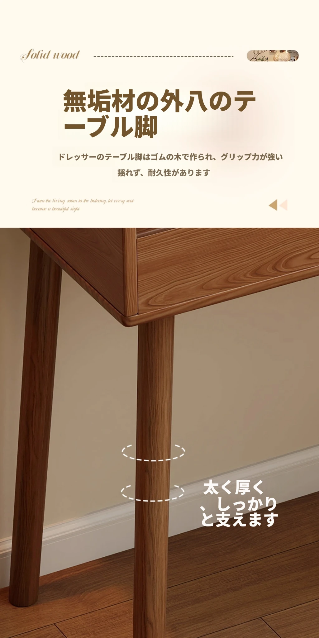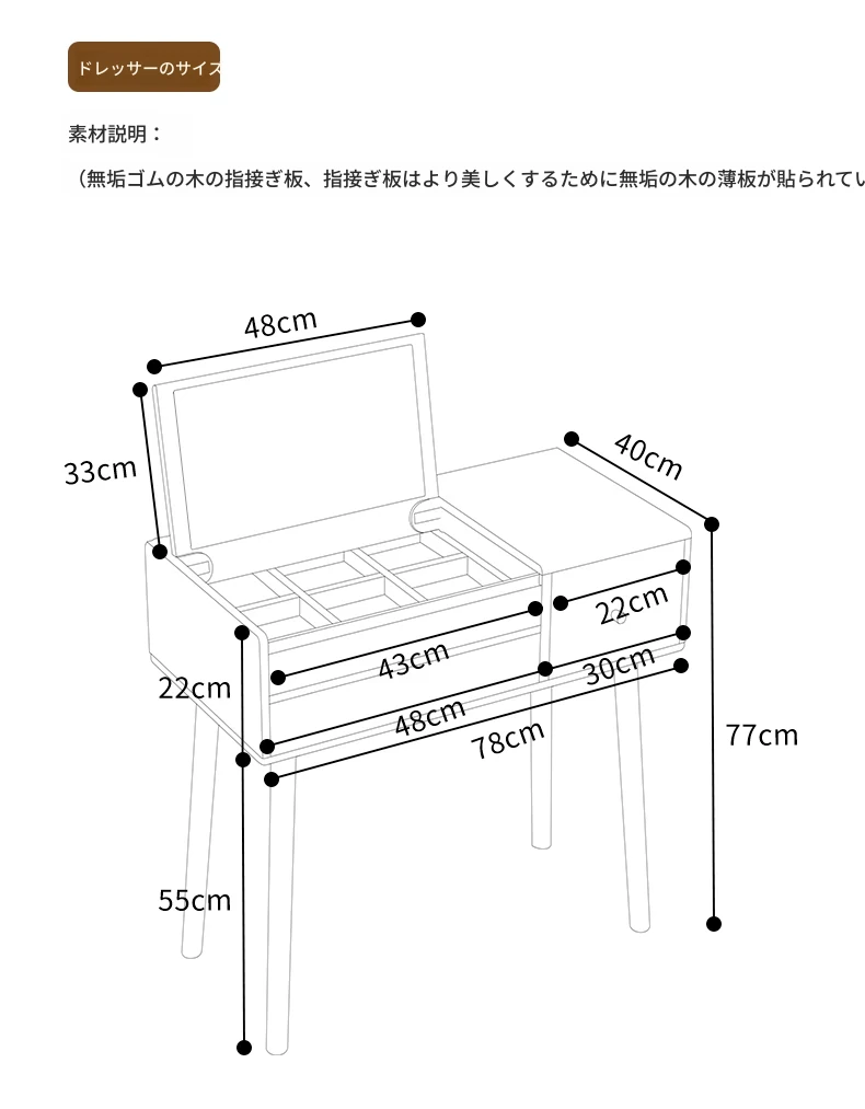 全木製の化粧台 - フリップトップ式の隠しミラー付き!小さな部屋にもぴったりなラバーウッド製の洗練されたドレッサー兼デスク。スタイリッシュで機能的なデザインで、あなたのビューティータイムを特別なものに!