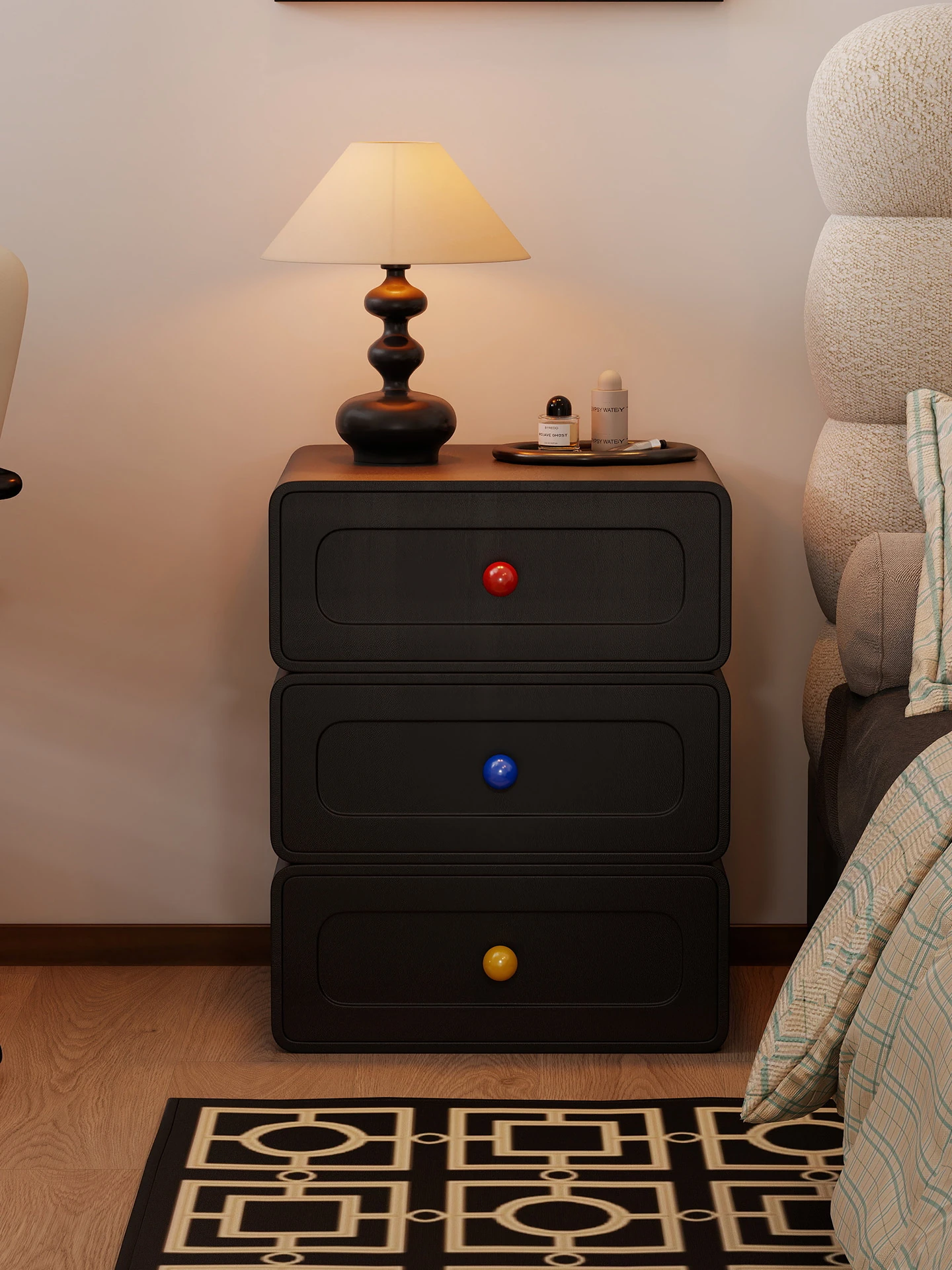 モダンミニマリストデザインの無垢材ベッドサイドテーブル - ブラックのスリム収納キャビネット。家の寝室に最適な3段収納で、シンプルでスタイリッシュなインテリアを演出し、快適な生活空間を提供します。