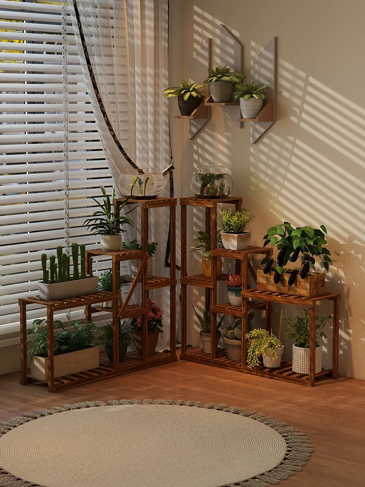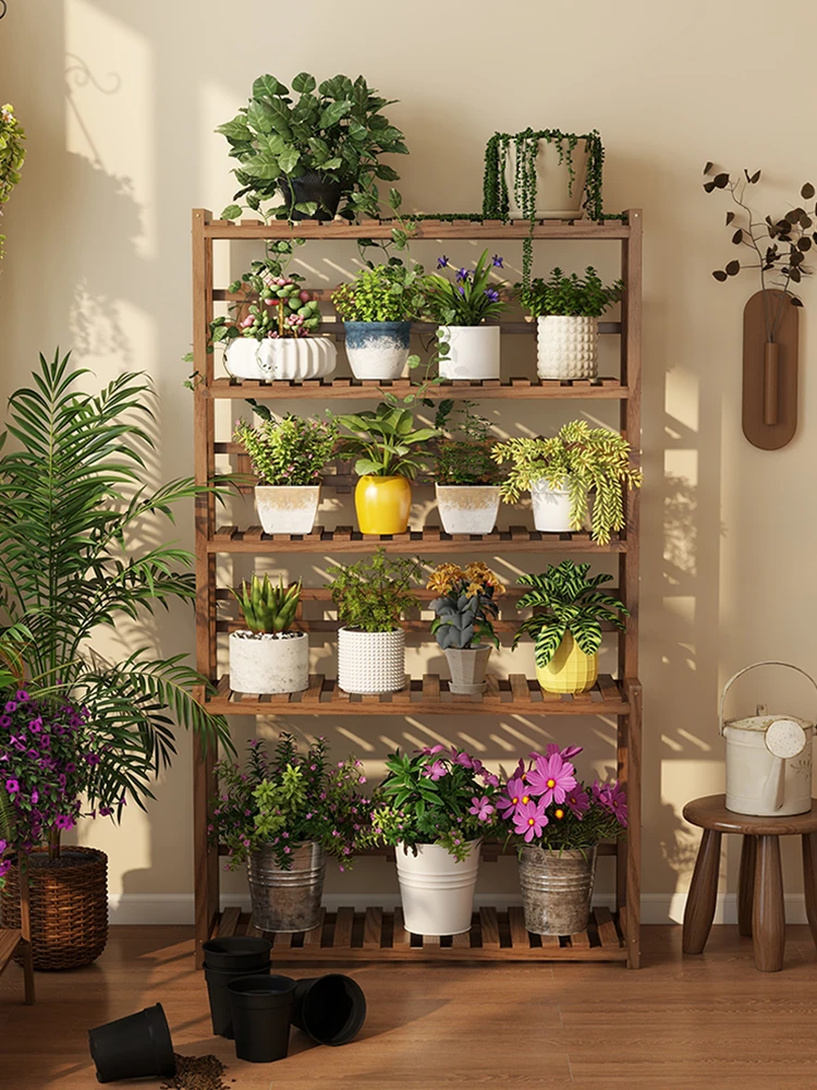 防腐処理された多肉植物用木製多層ラック!バルコニーや室内にぴったりのフロアスタンド。リビングや玄関に緑のアクセントを加え、グリーンローの鉢植えをおしゃれにディスプレイ!