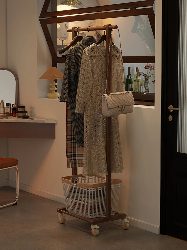 移動可能な木製ハンガーラック - ベッドサイドに最適な多機能衣類収納&ランドリーバスケット!おしゃれで実用的なデザインで、あなたの寝室をスッキリ整理整頓。