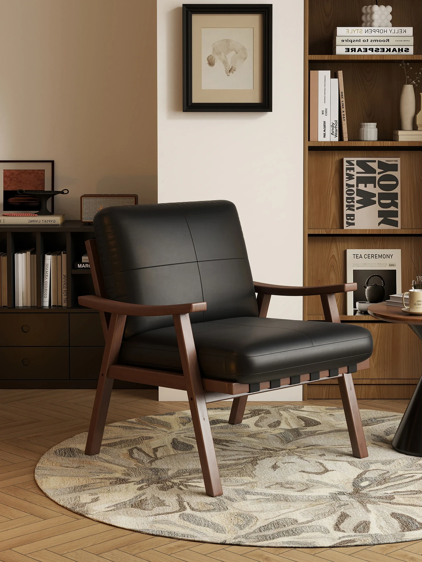 レトロな一人掛けソファ、木製フレームとレザー調クッション、リビングやバルコニーにぴったりのスタイリッシュで快適なデザイン。書斎や読書スペースにも最適な背もたれ付きのリラックスチェア!