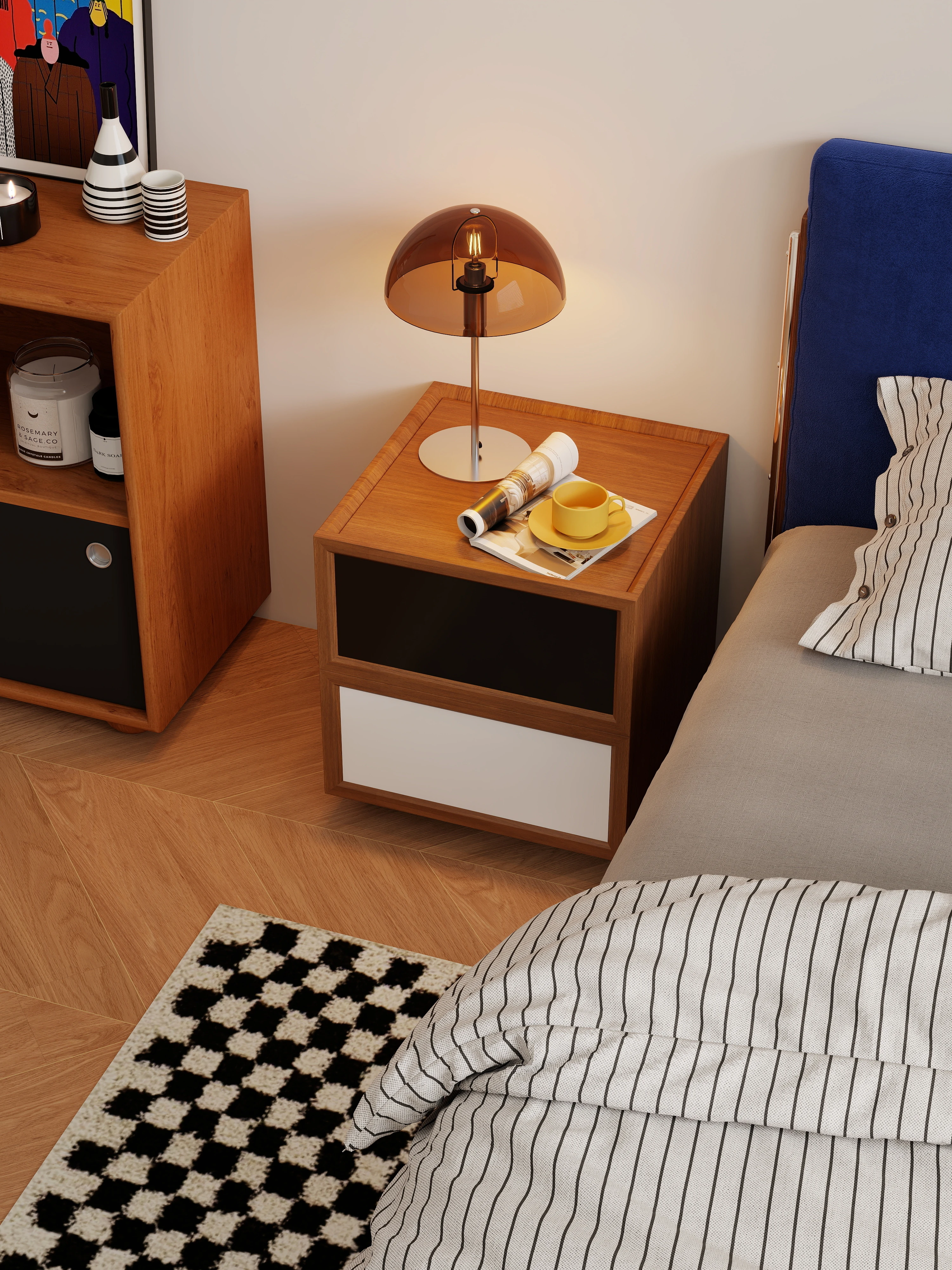 バウハウススタイルの無垢材ベッドサイドテーブル - 移動可能な収納ラックで、レトロな収納キャビネットとしても使える!寝室をスタイリッシュに彩る、小さな収納スペースに最適です。