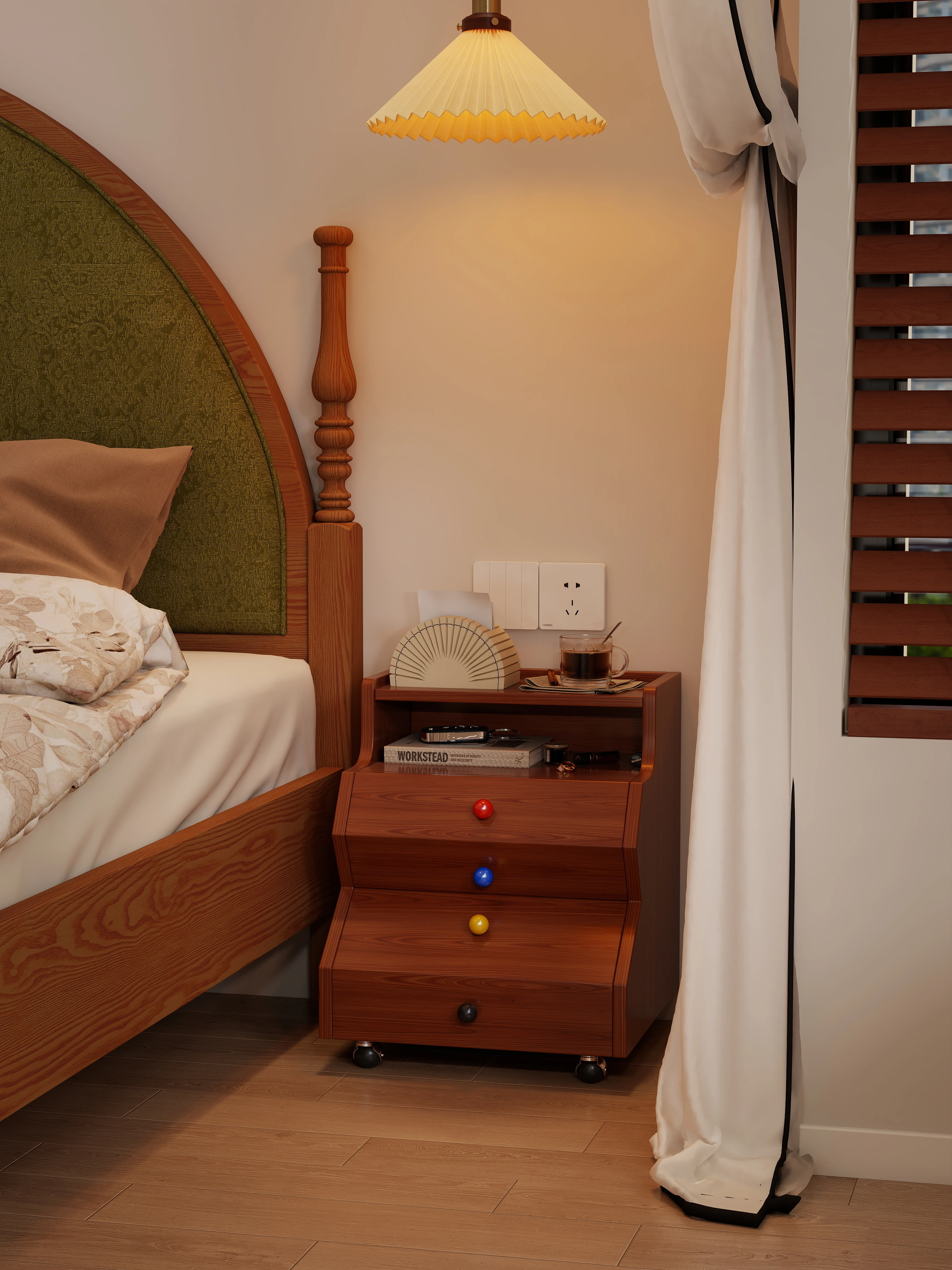アンティーク風の無垢材ベッドサイドキャビネット - 移動可能なクリエイティブ収納ボックス、レトロなデザインでおしゃれな寝室を演出!収納力抜群の便利な置物キャビネット。