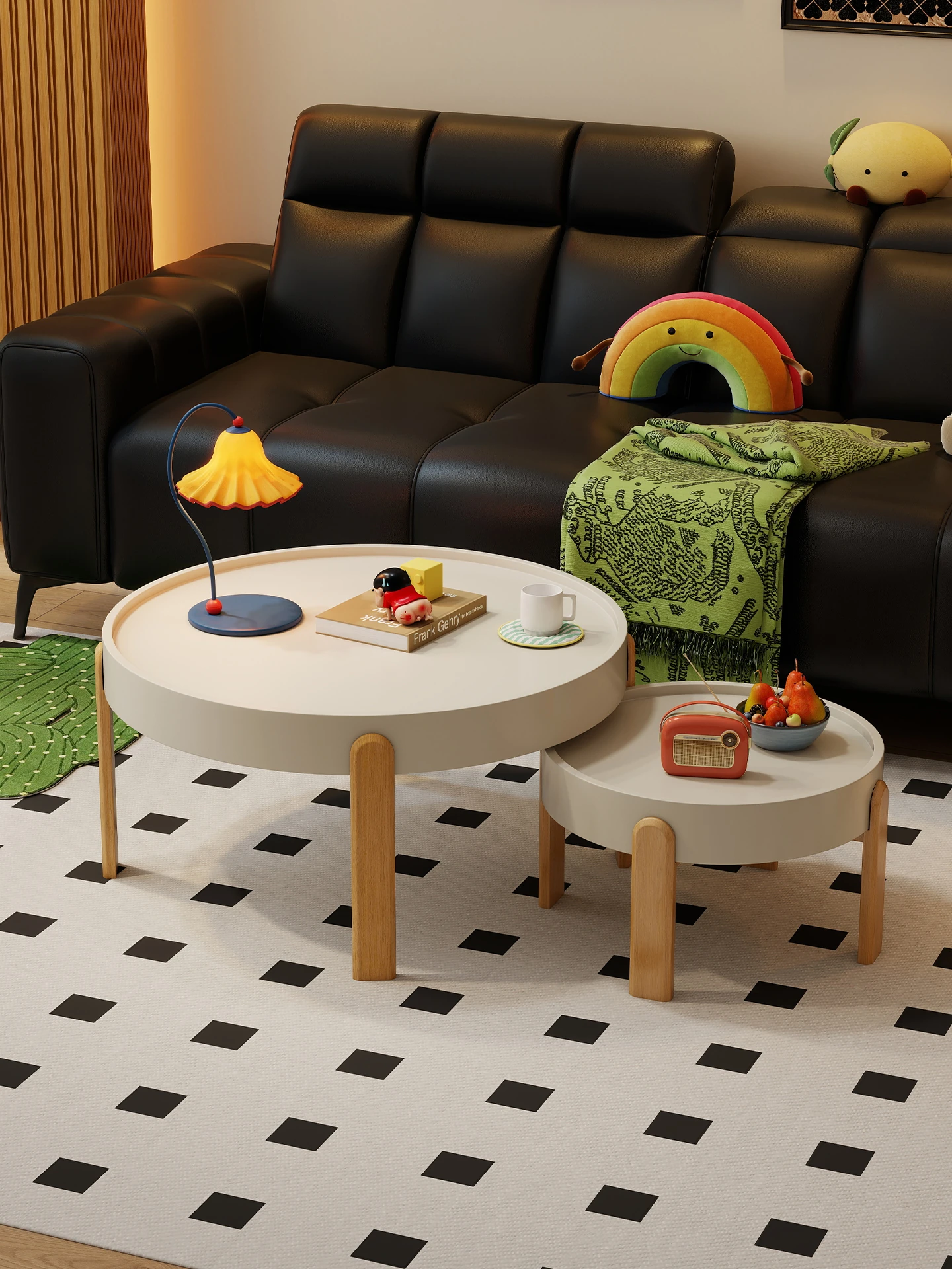 北欧デザインの天然木製コーヒーテーブル - モダンでシンプルな丸型、コンパクトなリビングルームに最適!移動可能なサイドテーブルとしても使える、便利なサイズの組み合わせ。おしゃれな空間を演出します!