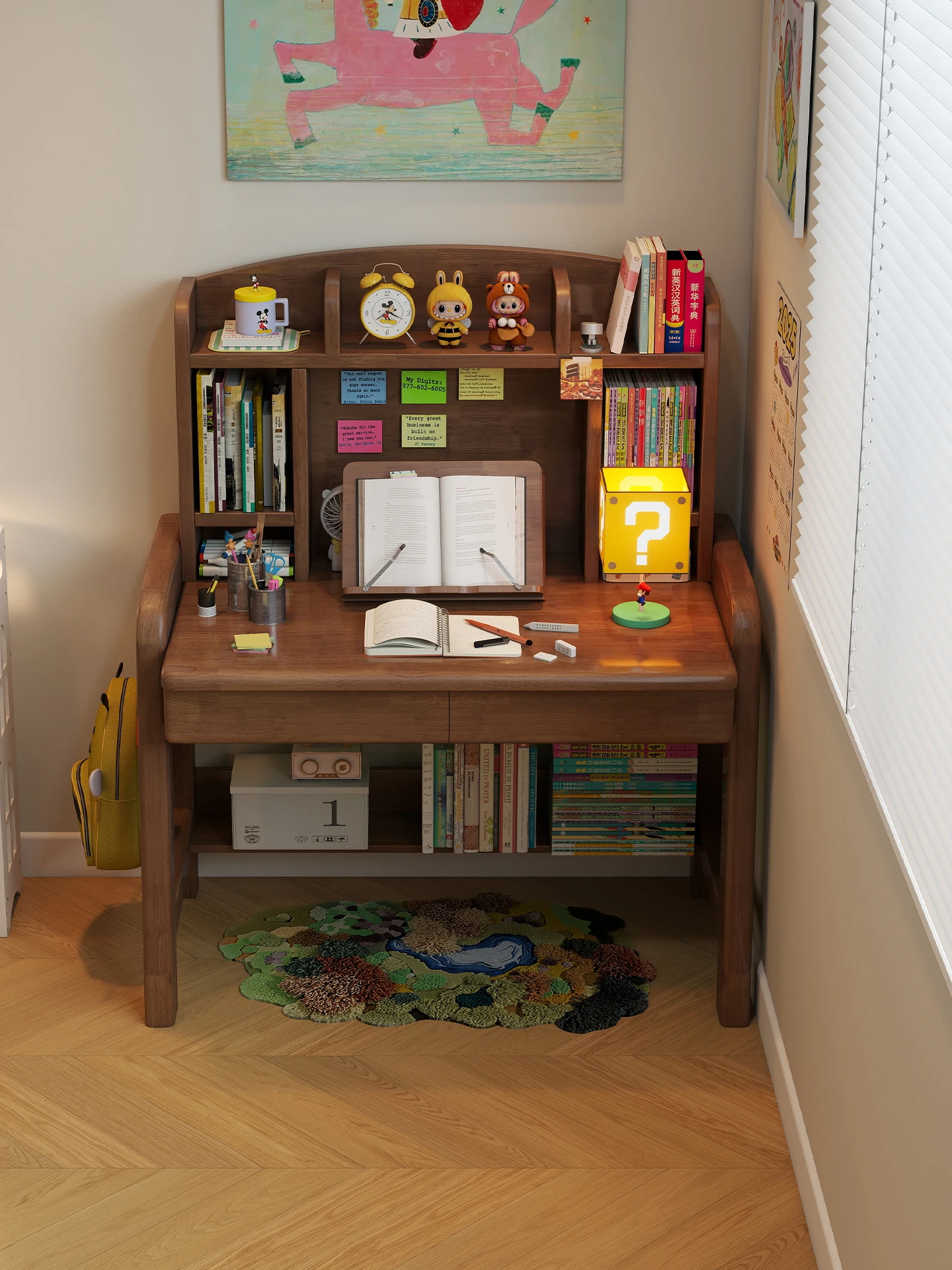 子供用無垢材のデスク&本棚一体型!昇降可能な学習デスクで、小学生・中学生に最適。快適な勉強環境を提供し、宿題や字を書くのが楽しくなる!