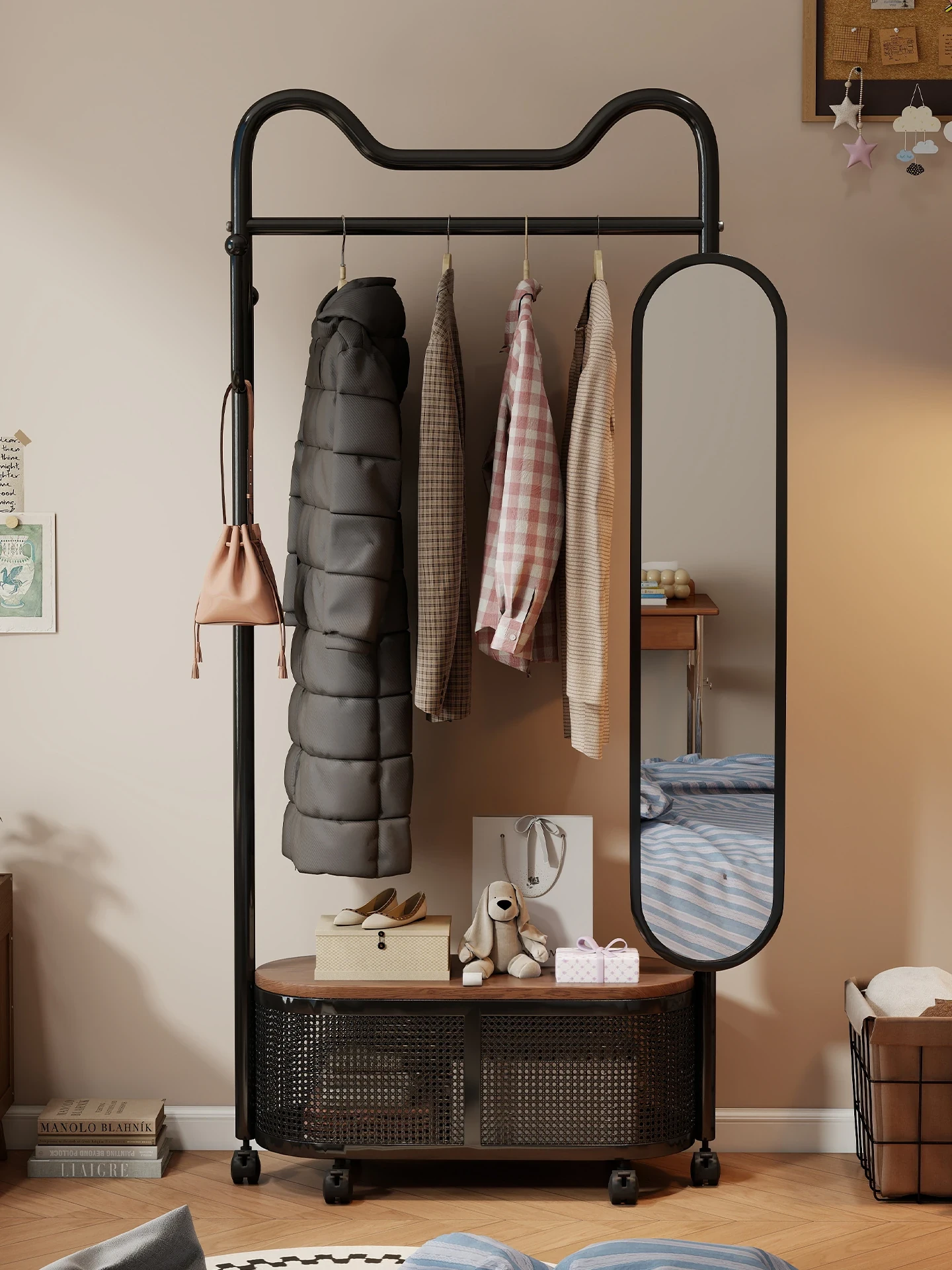 移動式ミラー付き衣類ラック - 家庭用のスタイリッシュな全身鏡とハンガーラックが一体化!多機能収納で、寝室をすっきり整理。おしゃれで便利なアイテムを手に入れましょう!