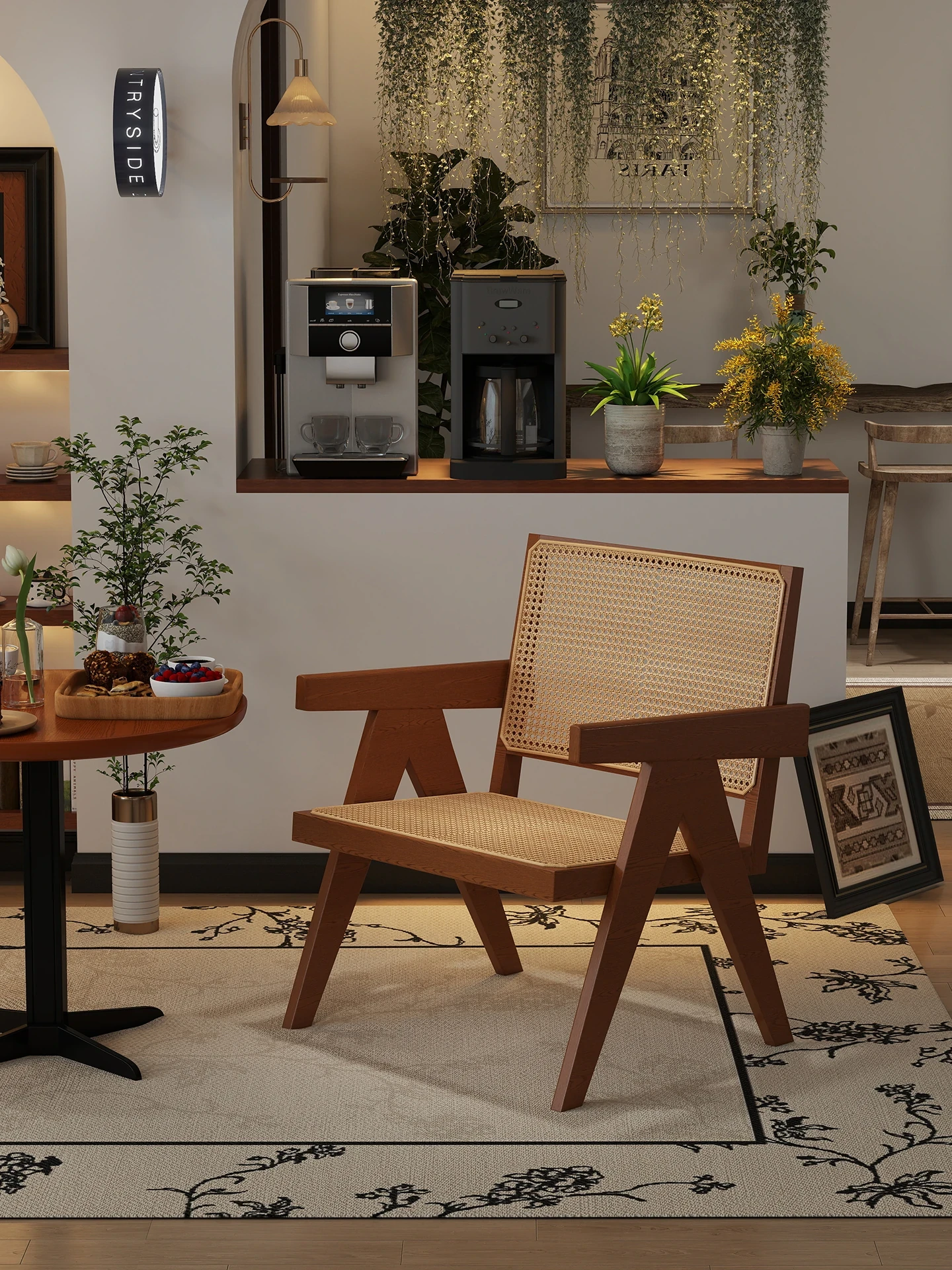 天然木材使用!シンプルでスタイリッシュな一人掛けチェア、チャンディーガールスタイルのリビング用アームチェア。カフェや書斎にぴったりなレトロなラタンチェアで、心地よいひとときをお楽しみください。