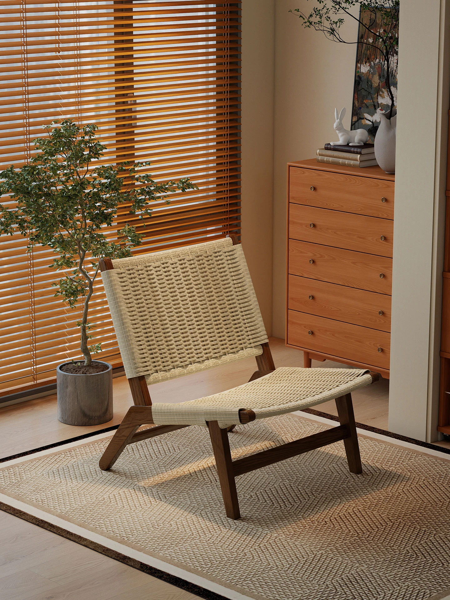 ナチュラルウッド風の無垢材ソファチェア|一人用の麻ひもデザイン|和風バルコニーやカフェに最適|読書やリラックスにぴったりな背もたれ付きのラウンジチェア